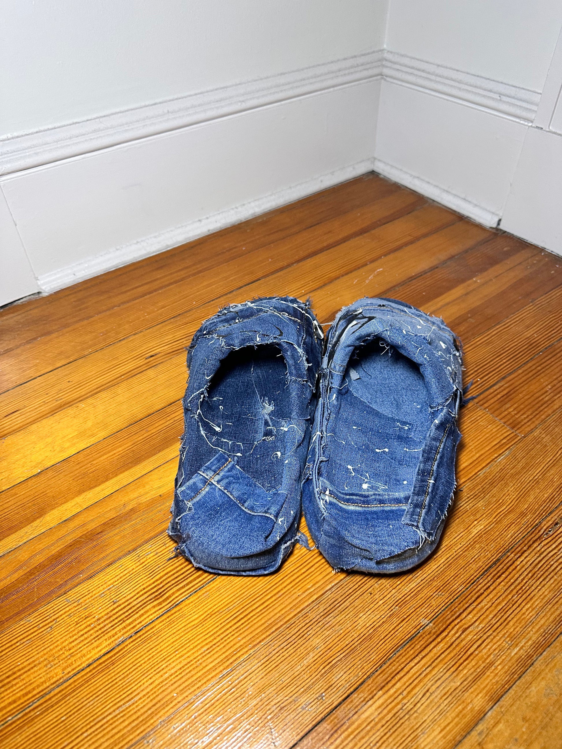 The frayed edges, distressed patches, and custom dye patterns are Unique to Each Shoe